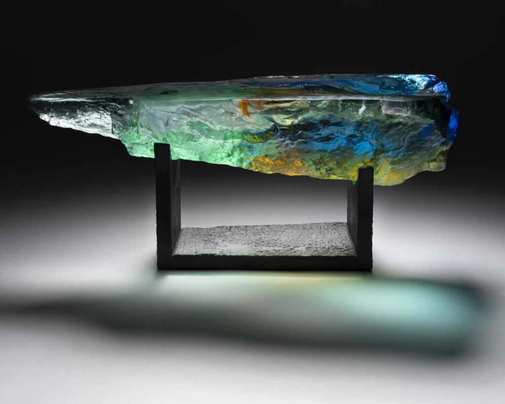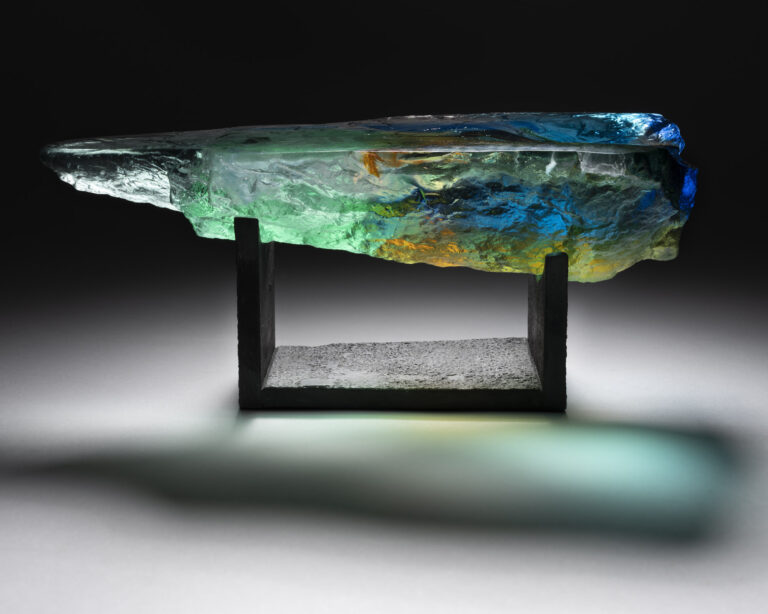 “Barbara Kenneally has managed to create 3 tiny microcosms of nature held within small lumps of glass that look uncannily like floating icebergs – one peers insde them, as though entering another realm.”